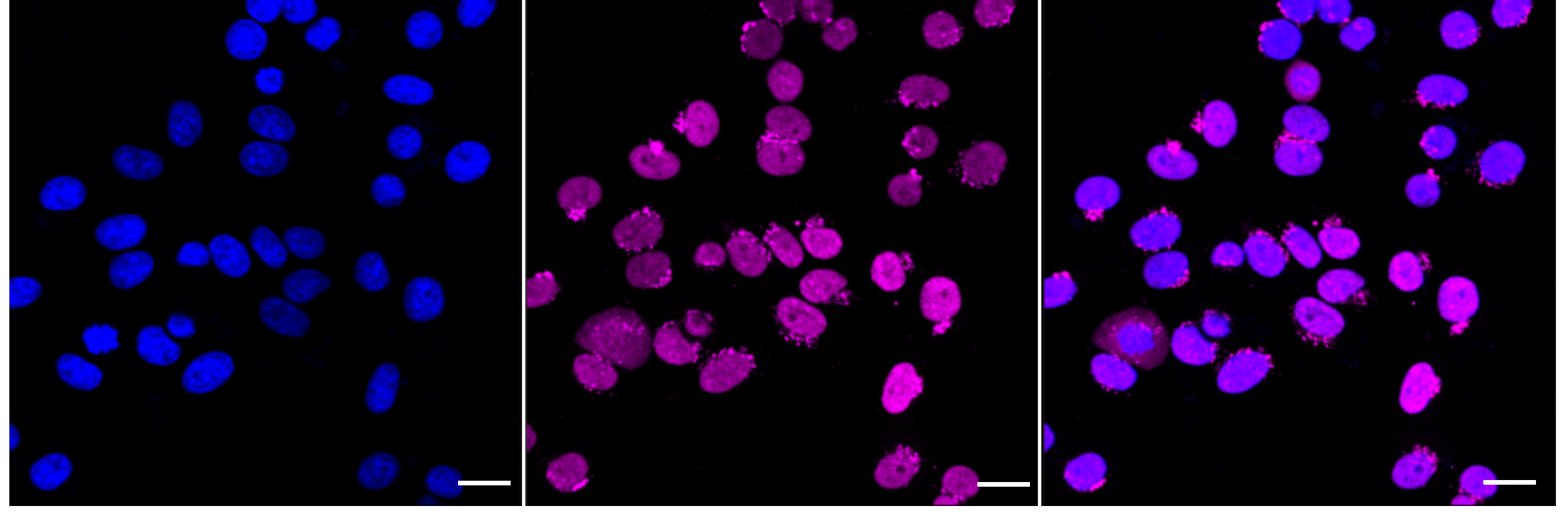 Immunocytochemical staining of HepG2 cells with Chromobox 5 antibody. Nuclei were stained blue with DAPI; Chromobox 5 was stained magenta with Alexa Fluor? 647. Images were taken using Leica stellaris 5. Protein abundance based on laser Intensity and smart gain: High. Scale bar: 20 μm.