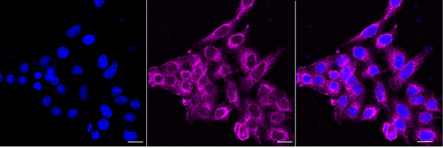 Immunocytochemical staining of HepG2 cells with CC2D1A antibody. Nuclei were stained blue with DAPI; CC2D1A was stained magenta with Alexa Fluor? 647. Images were taken using Leica stellaris 5. Protein abundance based on laser Intensity and smart gain: Medium. Scale bar, 20 μm.