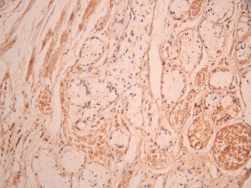 IHC image of CSB-RA004793MA1HU diluted at 1:50 and staining in paraffin-embedded human lymph node tissue performed on a Leica BondTM system. After dewaxing and hydration, antigen retrieval was mediated by high pressure in a citrate buffer (pH 6.0). Section was blocked with 10% normal goat serum 30min at RT. Then primary antibody (1% BSA) was incubated at 4°C overnight. The primary is detected by a Anti-Human lgG, Fcy Fragment Specific labeled by HRP and visualized using 0.05% DAB.