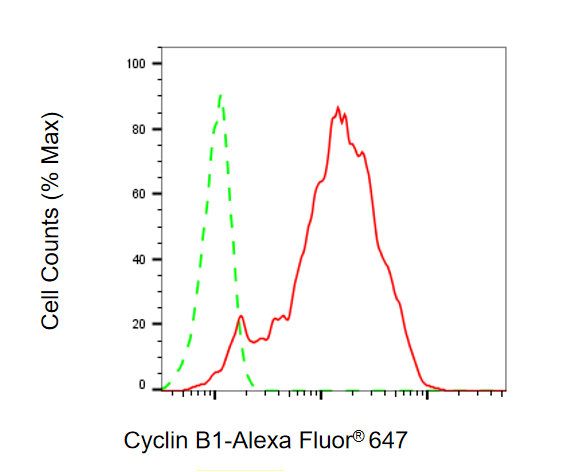 Flow cytometric analysis of Cyclin B1 expression in HeLa cells using Cyclin B1 antibody. Green, isotype control; red, Cyclin B1.