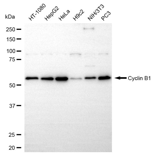 Western blotting analysis using cyclin B1 antibody. Total cell lysates (30 μg) from various cell lines were loaded and separated by SDS-PAGE. The blot was incubated with cyclin B1 antibody and HRP-conjugated goat anti-rabbit secondary antibody respectively.