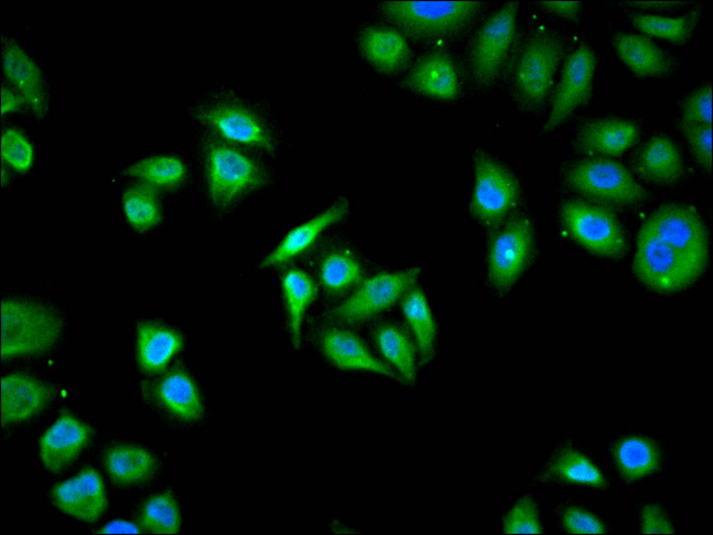 Immunofluorescence staining of Hela cell with CSB-RA045623A0HU at 1:50, counter-stained with DAPI. The cells were fixed in 4% formaldehyde, permeabilized using 0.2% Triton X-100 and blocked in 10% normal Goat Serum. The cells were then incubated with the antibody overnight at 4°C. The secondary antibody was Alexa Fluor 488-congugated AffiniPure Goat Anti-Rabbit IgG(H+L).
