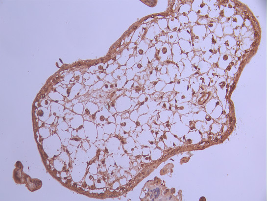IHC image of CSB-RA045623A0HU diluted at 1:100 and staining in paraffin-embedded human placenta tissue performed on a Leica BondTM system. After dewaxing and hydration, antigen retrieval was mediated by high pressure in a citrate buffer (pH 6.0). Section was blocked with 10% normal goat serum 30min at RT. Then primary antibody (1% BSA) was incubated at 4°C overnight. The primary is detected by a Goat anti-rabbit polymer IgG labeled by HRP and visualized using 0.05% DAB.