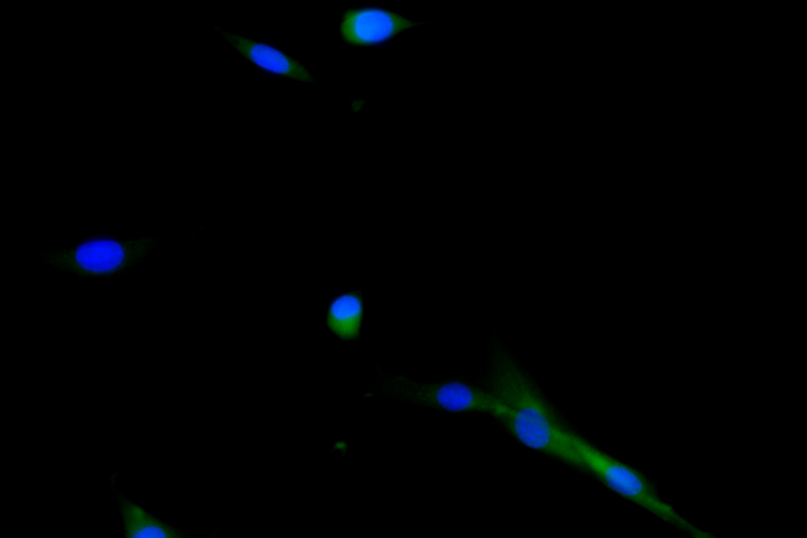 Immunofluorescence staining of NIH/3T3 cell with CSB-RA004926MA1HU at 1:30 ,counter-stained with DAPI. The cells were fixed in 4% formaldehyde, permeabilized using 0.2% Triton X-100 and blocked in 10% normal Goat Serum. The cells were then incubated with the antibody overnight at 4°C. The secondary antibody was Fluorescein (FITC) AffiniPure Goat Anti-Human IgG, Fcγ fragment specific.