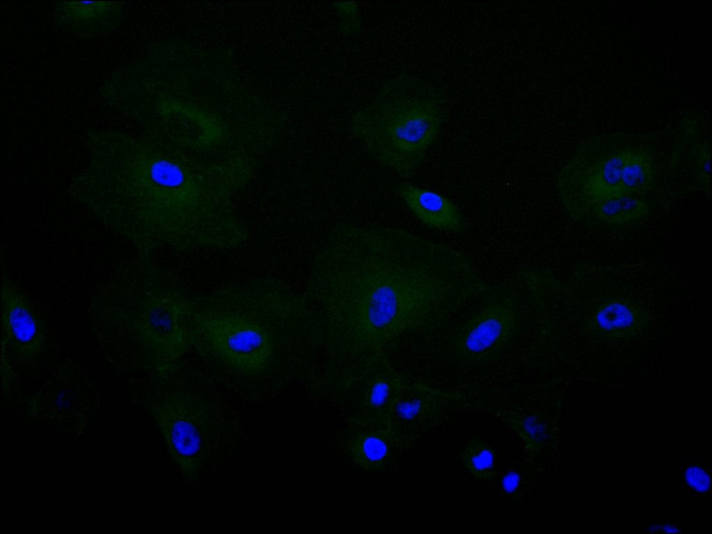 Immunofluorescence staining of A549 cell with CSB-RA004929MA3HU at 1:30 ,counter-stained with DAPI. The cells were fixed in 4% formaldehyde and blocked in 10% normal Goat Serum. The cells were then incubated with the antibody overnight at 4°C. The secondary antibody was Alexa Fluor 488-congugated AffiniPure Goat Anti-Human IgG(H+L).
