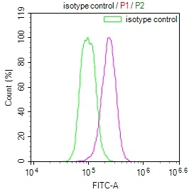 Overlay Peak curve showing JK cells surface stained with CSB-RA004931MA1HU (red line) at 1:100. Then 10% normal goat serum was Incubated to block non-specific protein-protein interactions followed by the antibody (1μg/1*106cells) for 45 min at 4°C. The secondary antibody used was FITC-conjugated Goat Anti-Mouse IgG(H+L) at 1/200 dilution for 35 min at 4°C. Isotype control antibody (green line) was mouse IgG1 (1μg/1*106cells) used under the same conditions. Acquisition of >10, 006 events was performed.