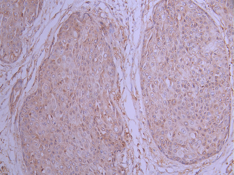 IHC image of CSB-RA439535A0HU diluted at 1:100 and staining in paraffin-embedded human pancreatic cancer performed on a Leica BondTM system. After dewaxing and hydration, antigen retrieval was mediated by high pressure in a citrate buffer (pH 6.0). Section was blocked with 10% normal goat serum 30min at RT. Then primary antibody (1% BSA) was incubated at 4°C overnight. The primary is detected by a Goat anti-rabbit polymer IgG labeled by HRP and visualized using 0.05% DAB.