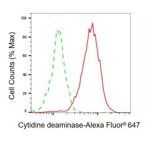 Flow cytometric analysis of Cytidine deaminase expression in HepG2 cells using Cytidine deaminase antibody. Green, isotype control; red, Cytidine deaminase.