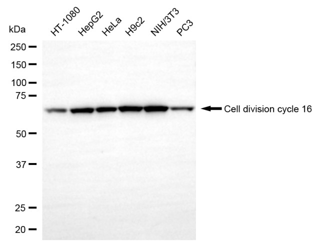 Western blotting analysis using cell division cycle 16 antibody. Total cell lysates (30 μg) from various cell lines were loaded and separated by SDS-PAGE. The blot was incubated with cell division cycle 16 antibody and HRP-conjugated goat anti-rabbit secondary antibody respectively.