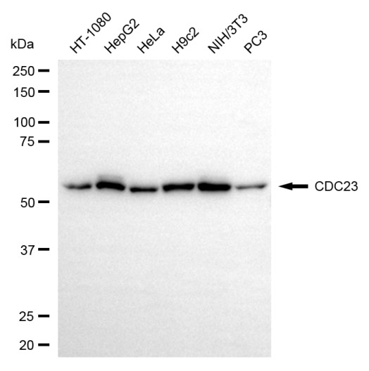 Western blotting analysis using CDC23 antibody. Total cell lysates (30 μg) from various cell lines were loaded and separated by SDS-PAGE. The blot was incubated with CDC23 antibody and HRP-conjugated goat anti-rabbit secondary antibody respectively.