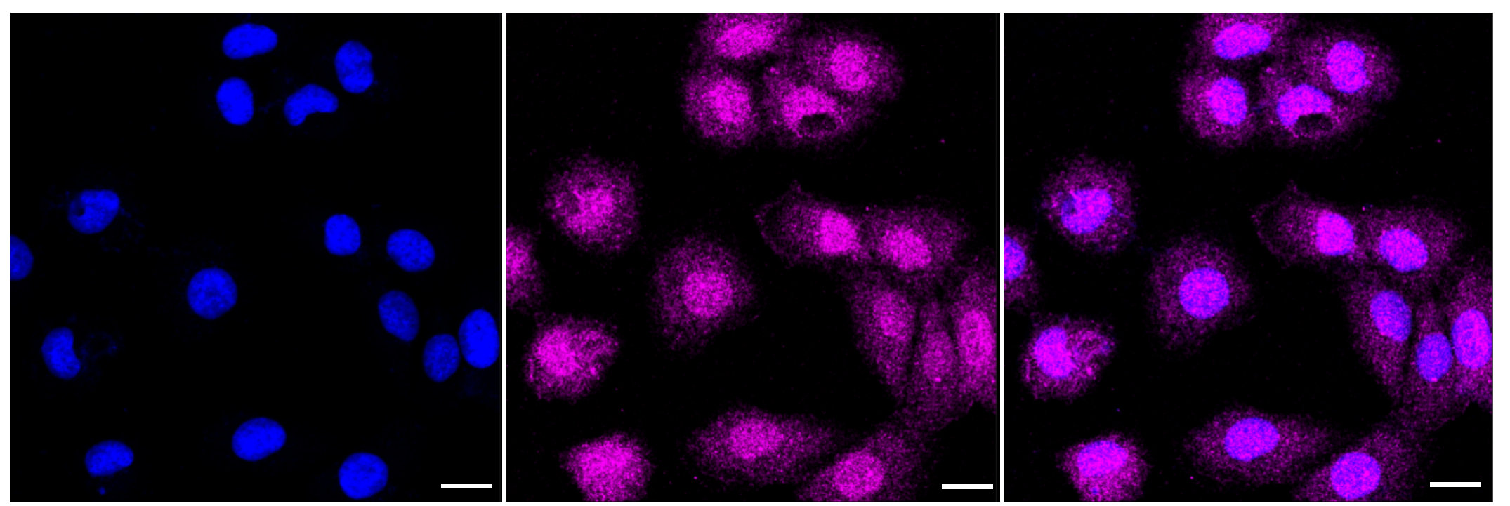 Immunocytochemical staining of HT-1080 cells with CDC34 antibody. Nuclei were stained blue with DAPI; CDC34 was stained magenta with Alexa Fluor? 647. Images were taken using Leica stellaris 5. Protein abundance based on laser Intensity and smart gain: Medium. Scale bar: 20 μm.