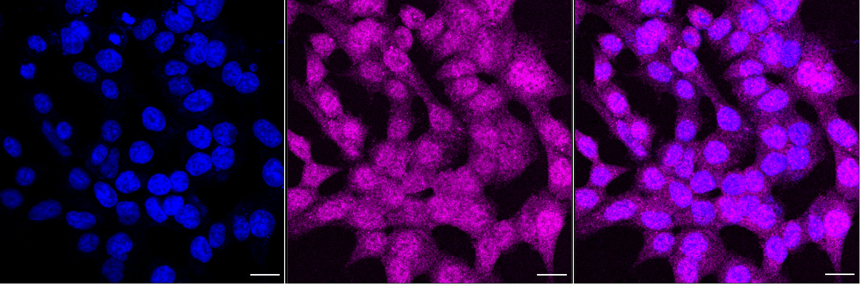 Immunocytochemical staining of HAP1 cells with CDC34 antibody. Nuclei were stained blue with DAPI;CDC34 was stained magenta with Alexa Fluor? 647. Images were taken using Leica stellaris 5. Protein abundance based on laser Intensity and smart gain: Medium. Scale bar, 20 μm.
