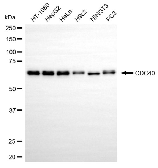 Western blotting analysis using CDC40 antibody. Total cell lysates (30 μg) from various cell lines were loaded and separated by SDS-PAGE. The blot was incubated with CDC40 antibody and HRP-conjugated goat anti-rabbit secondary antibody respectively.