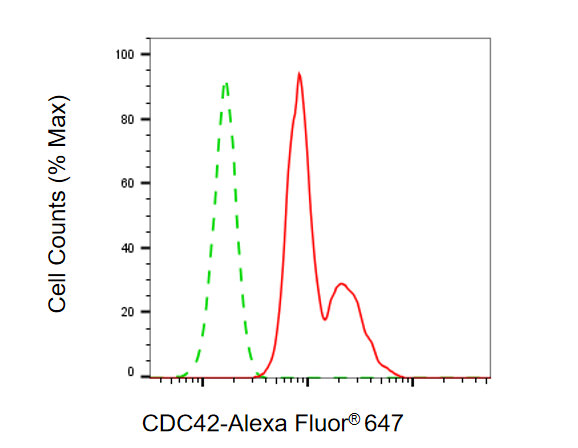Flow cytometric analysis of CDC42 expression in HepG2 cells using CDC42 antibody. Green, isotype control; red, CDC42.