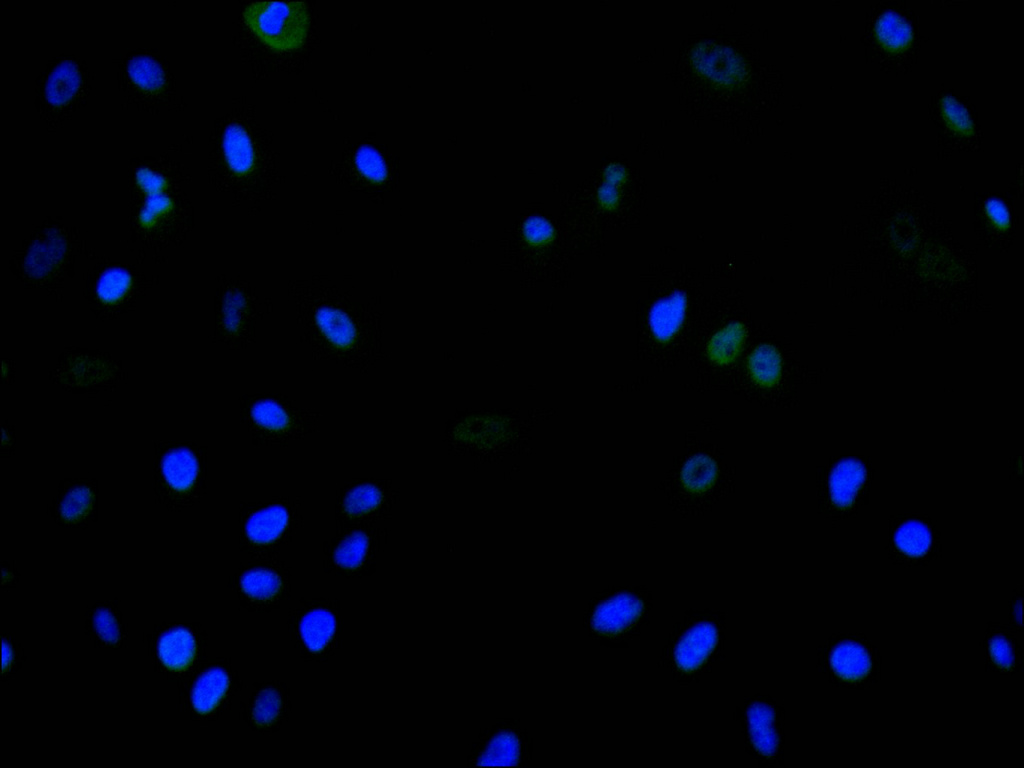 Immunofluorescence staining of A549 cell with CSB-RA436367A0HU at 1:50, counter-stained with DAPI. The cells were fixed in 4% formaldehyde, permeabilized using 0.2% Triton X-100 and blocked in 10% normal Goat Serum. The cells were then incubated with the antibody overnight at 4°C. The secondary antibody was Alexa Fluor 488-congugated AffiniPure Goat Anti-Rabbit IgG(H+L).