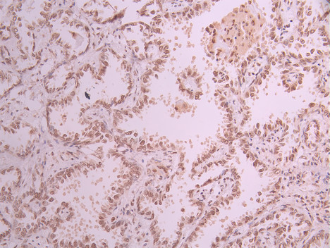 IHC image of CSB-RA436367A0HU diluted at 1:100 and staining in paraffin-embedded human lung cancer performed on a Leica BondTM system. After dewaxing and hydration, antigen retrieval was mediated by high pressure in a citrate buffer (pH 6.0). Section was blocked with 10% normal goat serum 30min at RT. Then primary antibody (1% BSA) was incubated at 4°C overnight. The primary is detected by a Goat anti-rabbit polymer IgG labeled by HRP and visualized using 0.05% DAB.