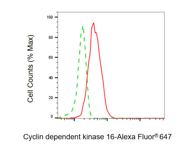 Flow cytometric analysis of Cyclin dependent kinase 16 expression in HepG2 cells using Cyclin dependent kinase 16 antibody. Green, isotype control; red, Cyclin dependent kinase 16.