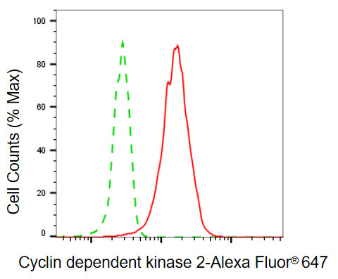 Flow cytometric analysis of cyclin dependent kinase 2 expression in HepG2 cells using cyclin dependent kinase 2 antibody. Green, isotype control; red, cyclin dependent kinase 2.