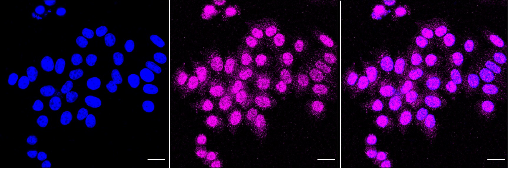 Immunocytochemical staining of HepG2 cells with Cyclin dependent kinase 2 antibody. Nuclei were stained blue with DAPI; Cyclin dependent kinase 2 was stained magenta with Alexa Fluor? 647. Images were taken using Leica stellaris 5. Protein abundance based on laser Intensity and smart gain: Medium. Scale bar, 20 μm.