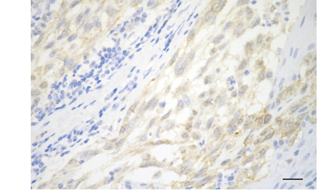 Immunohistochemistry was performed on paraffin-embedded human melanoma using cyclin dependent kinase 2 antibody. Antigen retrieval was done in sodium citrate buffer (pH 6.0). DAB was used for detection, with hematoxylin counterstaining. Images were acquired using a Nikon Ci-L Plus microscope (40× objective). Scale bar: 25 μm.