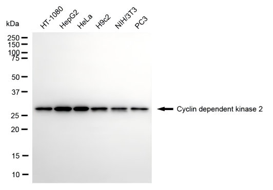 Western blotting analysis using cyclin dependent kinase 2 antibody. Total cell lysates (30 μg) from various cell lines were loaded and separated by SDS-PAGE. The blot was incubated with cyclin dependent kinase 2 antibody and HRP-conjugated goat anti-rabbit secondary antibody respectively.