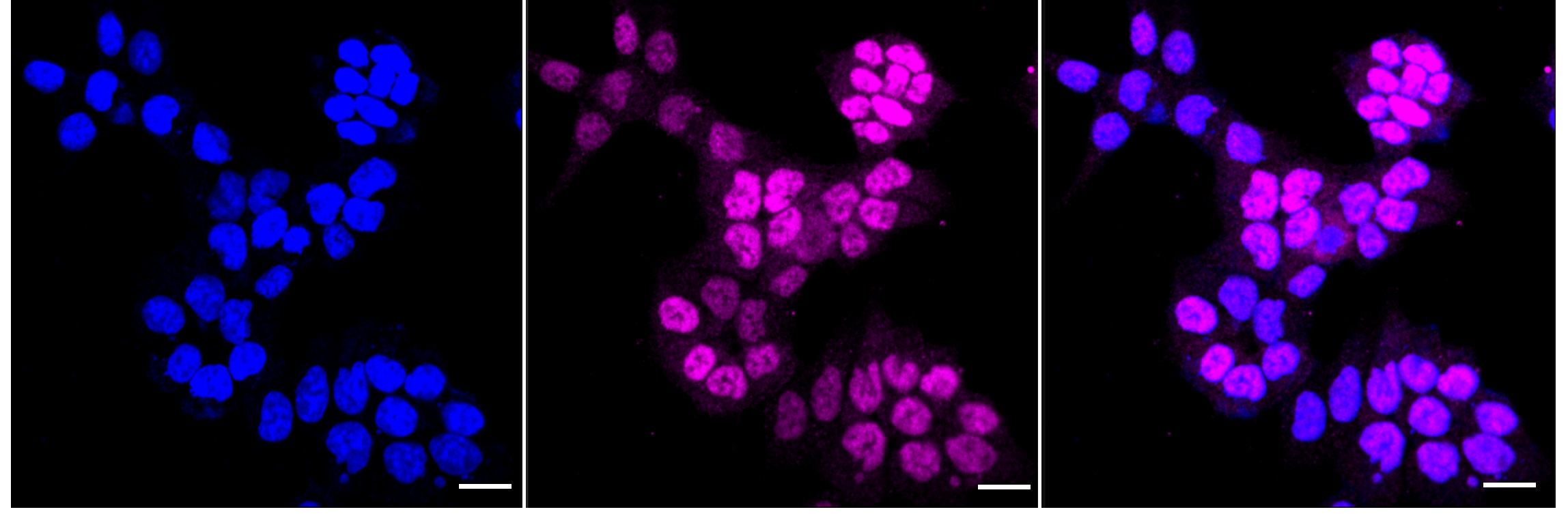 Immunocytochemical staining of HAP-1 with cyclin dependent kinase 6 antibody. Nuclei were stained blue with DAPI; Cyclin dependent kinase 6 was stained magenta with Alexa Fluor? 647. Images were taken using Leica stellaris 5. Protein abundance based on laser Intensity and smart gain: Medium. Scale bar: 20 μm.