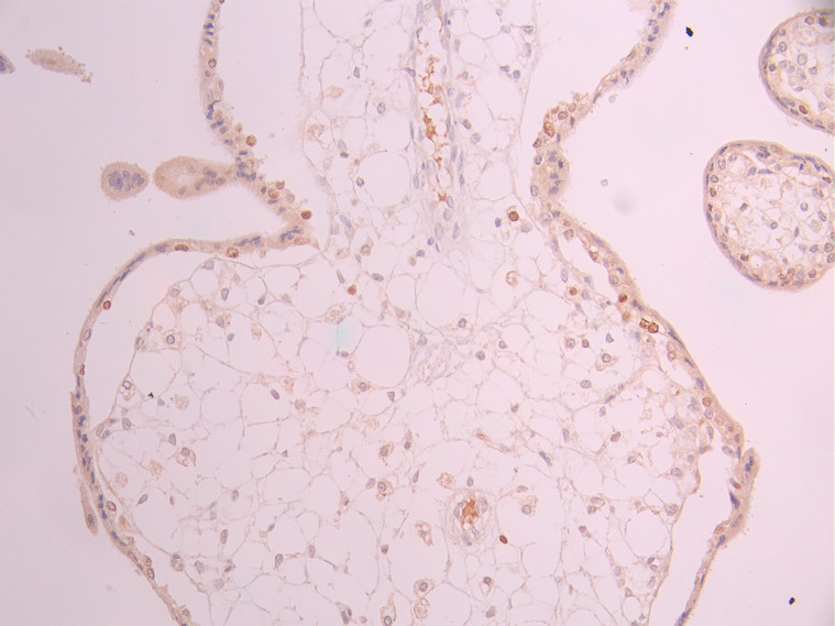 IHC image of CSB-RA047238A0HU diluted at 1:100 and staining in paraffin-embedded human placenta tissue performed on a Leica BondTM system. After dewaxing and hydration, antigen retrieval was mediated by high pressure in a citrate buffer (pH 6.0). Section was blocked with 10% normal goat serum 30min at RT. Then primary antibody (1% BSA) was incubated at 4°C overnight. The primary is detected by a Goat anti-rabbit polymer IgG labeled by HRP and visualized using 0.05% DAB.