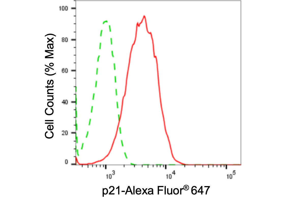 Flow cytometric analysis of p21 expression in HT-1080 cells using p21 antibody. Green, isotype control; red, p21.