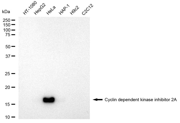 Western blotting analysis using Cyclin dependent kinase inhibitor 2A antibody. Total cell lysates (30 μg) from various cell lines were loaded and separated by SDS-PAGE. The blot was incubated with Cyclin dependent kinase inhibitor 2A antibody and HRP-conjugated goat anti-rabbit secondary antibody respectively.
