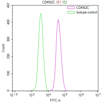 Overlay Peak curve showing jurkat cells stained with CSB-RA580611A0HU (red line) at 1:100. The cells were fixed in 4% formaldehyde and permeated by 0.2% TritonX-100 for 10min. Then 10% normal goat serum to block non-specific protein-protein interactions followed by the antibody (1ug/1*106cells) for 45min at 4℃. The secondary antibody used was FITC-conjugated goat anti-rabbit IgG (H+L) at 1/200 dilution for 35min at 4℃.Control antibody (green line) was Rabbit IgG (1ug/1*106cells) used under the same conditions. Acquisition of >10,000 events was performed.