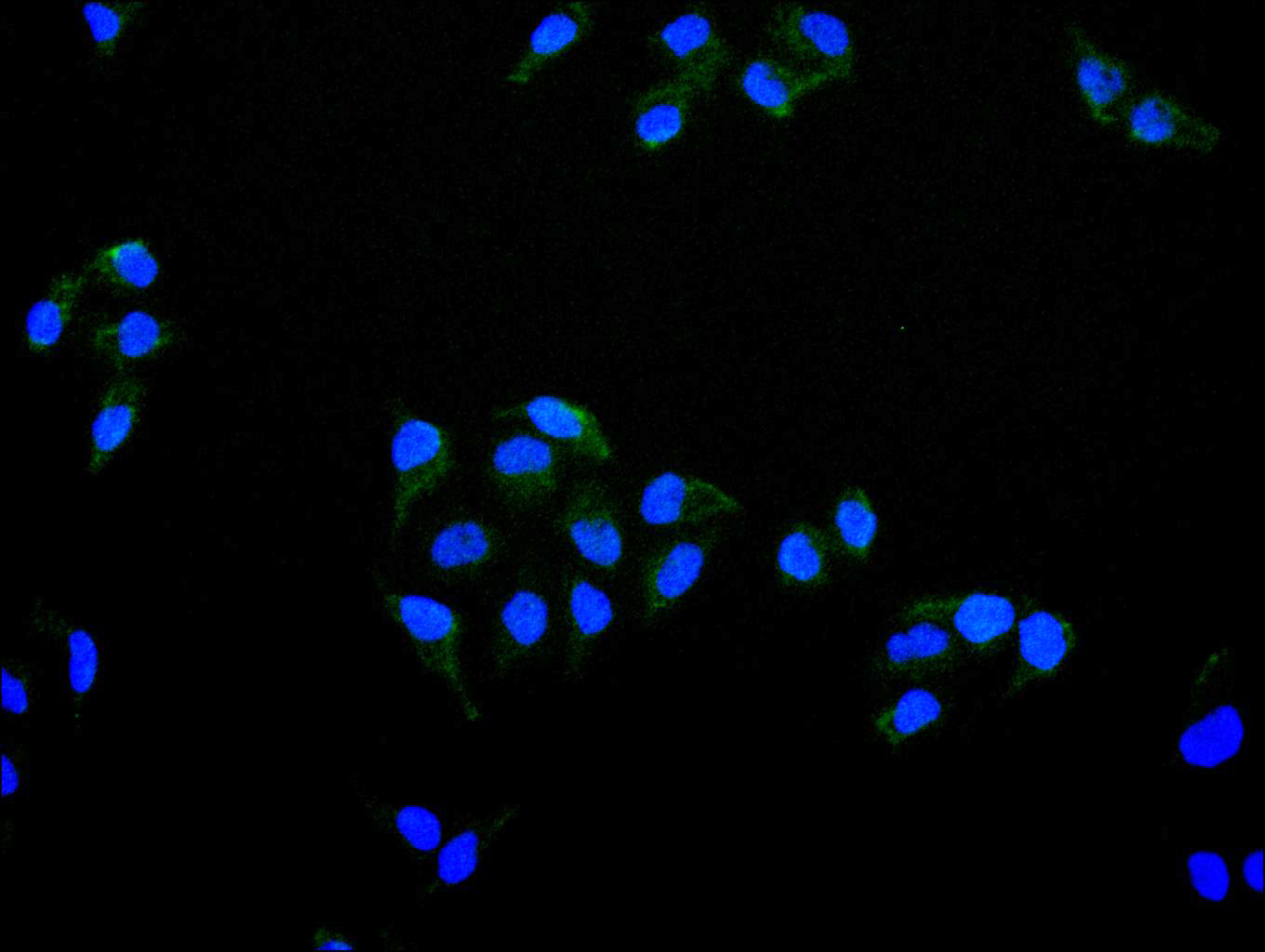Immunofluorescence staining of Hela cell with CSB-RA699720A0HU at 1:50, counter-stained with DAPI. The cells were fixed in 4% formaldehyde, permeabilized using 0.2% Triton X-100 and blocked in 10% normal Goat Serum. The cells were then incubated with the antibody overnight at 4°C. The secondary antibody was Alexa Fluor 488-congugated AffiniPure Goat Anti-Rabbit IgG(H+L).