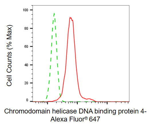 Flow cytometric analysis of chromodomain helicase DNA binding protein 4 expression in HepG2 cells using chromodomain helicase DNA binding protein 4 antibody. Green, isotype control; red, chromodomain helicase DNA binding protein 4.