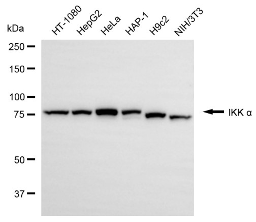 Western blotting analysis using IKK α antibody. Total cell lysates (30 μg) from various cell lines were loaded and separated by SDS-PAGE. The blot was incubated with IKK α antibody and HRP-conjugated goat anti-rabbit secondary antibody respectively.