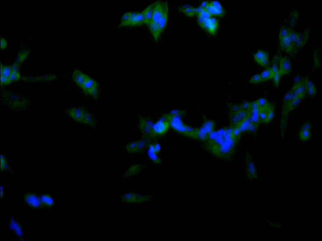 Immunofluorescence staining of SH-SY5Y cell with CSB-RA287839A0HU at 1:50, counter-stained with DAPI. The cells were fixed in 4% formaldehyde, permeabilized using 0.2% Triton X-100 and blocked in 10% normal Goat Serum. The cells were then incubated with the antibody overnight at 4°C. The secondary antibody was Alexa Fluor 488-congugated AffiniPure Goat Anti-Rabbit IgG(H+L).