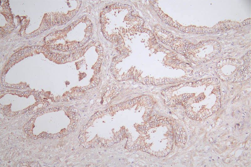 IHC image of CSB-RA037143A0HU diluted at 1:100 and staining in paraffin-embedded human prostate tissue performed on a Leica BondTM system. After dewaxing and hydration, antigen retrieval was mediated by high pressure in a citrate buffer (pH 6.0). Section was blocked with 10% normal goat serum 30min at RT. Then primary antibody (1% BSA) was incubated at 4°C overnight. The primary is detected by a Goat anti-rabbit polymer IgG labeled by HRP and visualized using 0.77% DAB.