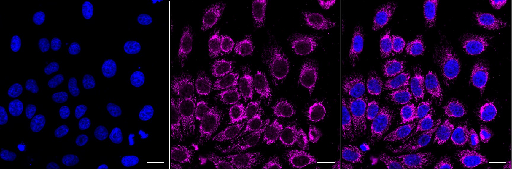 Immunocytochemical staining of HepG2 cells with CLPP antibody. Nuclei were stained blue with DAPI; CLPP was stained magenta with Alexa Fluor? 647. Images were taken using Leica stellaris 5. Protein abundance based on laser Intensity and smart gain: High. Scale bar, 20 μm.