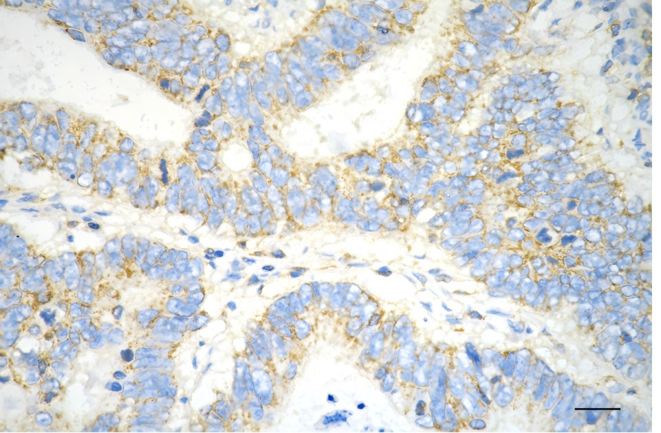 Immunohistochemistry was performed on paraffin-embedded human sigmoid colon carcinoma using CLPP antibody. Antigen retrieval was done in sodium citrate buffer (pH 6.0). DAB was used for detection, with hematoxylin counterstaining. Images were acquired using a Nikon Ci-L Plus microscope (40× objective). Scale bar: 25 μm.