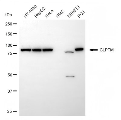 Western blotting analysis using CLPTM1 antibody. Total cell lysates (30 μg) from various cell lines were loaded and separated by SDS-PAGE. The blot was incubated with CLPTM1 antibody and HRP-conjugated goat anti-rabbit secondary antibody respectively.