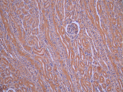 IHC image of CSB-RA172477A0HU diluted at 1:100 and staining in paraffin-embedded mouse kidney tissue performed on a Leica BondTM system. After dewaxing and hydration, antigen retrieval was mediated by high pressure in a citrate buffer (pH 6.0). Section was blocked with 10% normal goat serum 30min at RT. Then primary antibody (1% BSA) was incubated at 4°C overnight. The primary is detected by a Goat anti-rabbit polymer IgG labeled by HRP and visualized using 0.05% DAB.