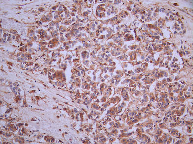 IHC image of CSB-RA172477A0HU diluted at 1:100 and staining in paraffin-embedded human breast cancer performed on a Leica BondTM system. After dewaxing and hydration, antigen retrieval was mediated by high pressure in a citrate buffer (pH 6.0). Section was blocked with 10% normal goat serum 30min at RT. Then primary antibody (1% BSA) was incubated at 4°C overnight. The primary is detected by a Goat anti-rabbit polymer IgG labeled by HRP and visualized using 0.05% DAB.