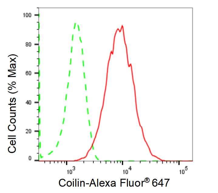 Flow cytometric analysis of Coilin expression in HepG2 cells using Coilin antibody. Green, isotype control; red, Coilin.