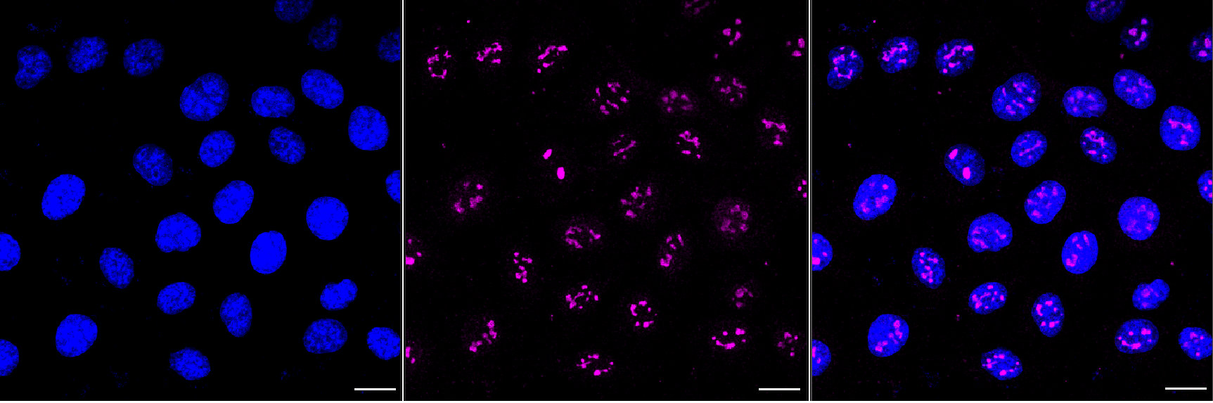 Immunocytochemical staining of HT-1080 cells with Catechol-O-methyltransferase antibody. Nuclei were stained blue with DAPI; Catechol-O-methyltransferase was stained magenta with Alexa Fluor? 647. Images were taken using Leica stellaris 5. Protein abundance based on laser Intensity and smart gain: Medium. Scale bar, 20 μm.