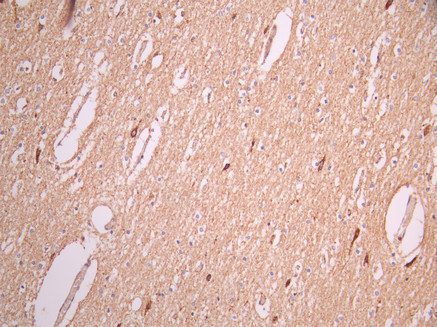 IHC image of CSB-RA918888A0HU diluted at 1:100 and staining in paraffin-embedded human brain tissue performed on a Leica BondTM system. After dewaxing and hydration, antigen retrieval was mediated by high pressure in a citrate buffer (pH 6.0). Section was blocked with 10% normal goat serum 30min at RT. Then primary antibody (1% BSA) was incubated at 4°C overnight. The primary is detected by a Goat anti-rabbit polymer IgG labeled by HRP and visualized using 0.05% DAB.