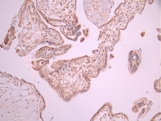 IHC image of CSB-RA971760A0HU diluted at 1:100 and staining in paraffin-embedded human placenta tissue performed on a Leica BondTM system. After dewaxing and hydration, antigen retrieval was mediated by high pressure in a citrate buffer (pH 6.0). Section was blocked with 10% normal goat serum 30min at RT. Then primary antibody (1% BSA) was incubated at 4°C overnight. The primary is detected by a Goat anti-rabbit polymer IgG labeled by HRP and visualized using 0.05% DAB.