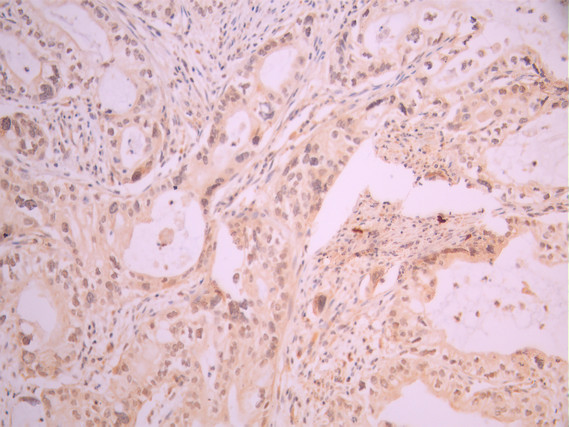 IHC image of CSB-RA971760A0HU diluted at 1:100 and staining in paraffin-embedded human pancreatic cancer performed on a Leica BondTM system. After dewaxing and hydration, antigen retrieval was mediated by high pressure in a citrate buffer (pH 6.0). Section was blocked with 10% normal goat serum 30min at RT. Then primary antibody (1% BSA) was incubated at 4°C overnight. The primary is detected by a Goat anti-rabbit polymer IgG labeled by HRP and visualized using 0.05% DAB.