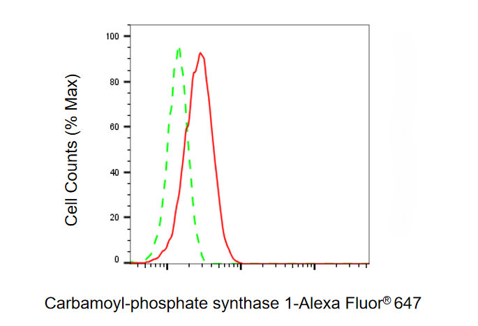 Flow cytometric analysis of Carbamoyl-phosphate synthase 1 expression in HepG2 cells using Carbamoyl-phosphate synthase 1 antibody. Green, isotype control; red, Carbamoyl-phosphate synthase 1.