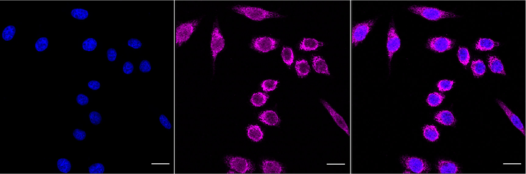 Immunocytochemical staining of HepG2 cells with Carbamoyl-phosphate synthase 1 antibody. Nuclei were stained blue with DAPI; Carbamoyl-phosphate synthase 1 was stained magenta with Alexa Fluor? 647. Images were taken using Leica stellaris 5. Protein abundance based on laser Intensity and smart gain: High. Scale bar, 20 μm.