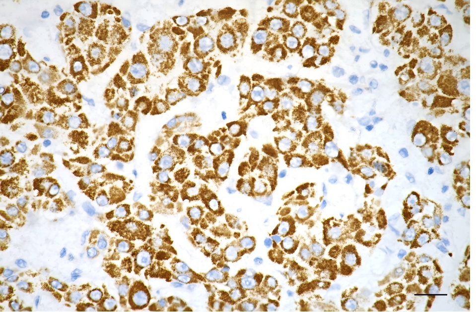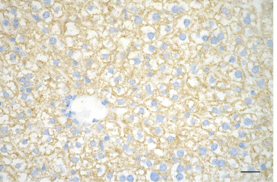 Immunohistochemistry was performed on paraffin-embedded human hepatocarcinoma using carbamoyl-phosphate synthase 1 antibody. Antigen retrieval was done in sodium citrate buffer (pH 6.0). DAB was used for detection, with hematoxylin counterstaining. Images were acquired using a Nikon Ci-L Plus microscope (40× objective). Scale bar: 25 μm.