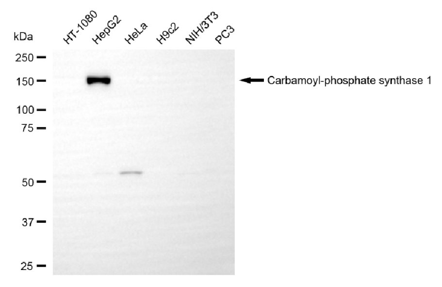 Western blotting analysis using carbamoyl-phosphate synthase 1 antibody. Total cell lysates (30 μg) from various cell lines were loaded and separated by SDS-PAGE. The blot was incubated with carbamoyl-phosphate synthase 1 antibody and HRP-conjugated goat anti-rabbit secondary antibody respectively.