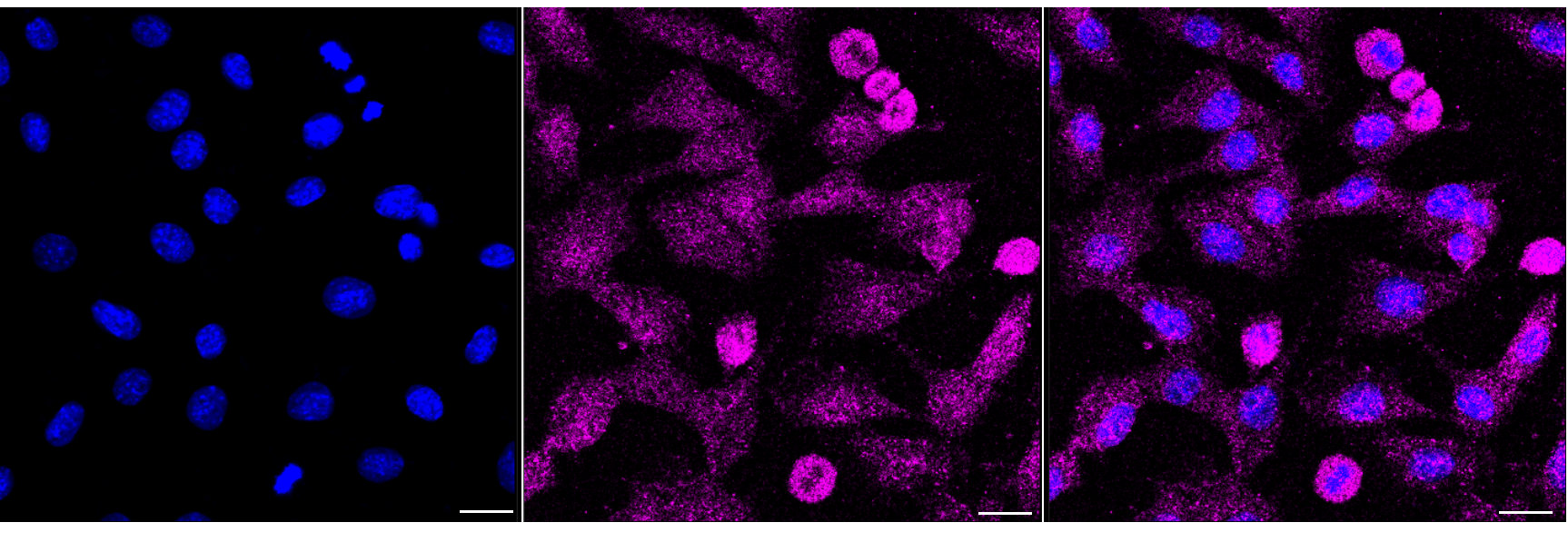 Immunocytochemical staining of C2C12 cells with Cellular retinoic acid binding protein 1 antibody. Nuclei were stained blue with DAPI; Cellular retinoic acid binding protein 1 was stained magenta with Alexa Fluor? 647. Images were taken using Leica stellaris 5. Protein abundance based on laser Intensity and smart gain: Low. Scale bar, 20 μm.